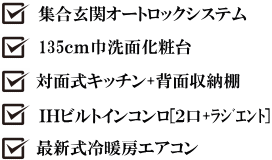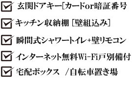 | 設 備 | 追い焚き給湯 バス・トイレ別 洗髪洗面化粧台 ガラストップIHコンロ 瞬間式温水洗浄便座 対面キッチン 浴室乾燥機 洗濯機置場 寒冷地仕様エアコン TV付インターホン BS・CSアンテナ インターネット接続無料 各部屋Wi-Fiルーター備付(無料) 2.7mクローゼット 大型シューズクローク 室内物干し(ホスクリーン) 通路・駐車場ロードヒーティング ガス種別 : 都市ガス LED照明器具(全照明) 玄関デジタルロックキー 集合玄関2か所オートロックシステム 宅配ボックス 通路・駐車場に防犯カメラ16台設置(録画式)。 | ||