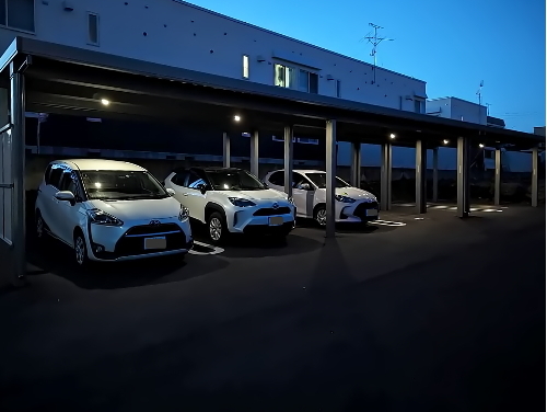 一台当たりの駐車巾が2.9mでらくらく駐車、冬の煩わしい車上の除雪が不要。夜間も照明付きで、駐車が容易です。防犯上もカメラ2台設置で安心です。
