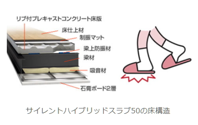 二階の床はRCコンクリート27cm厚に匹敵の防音性で業界初の(サイレントハイブリッドスラブ50)を採用